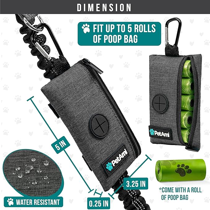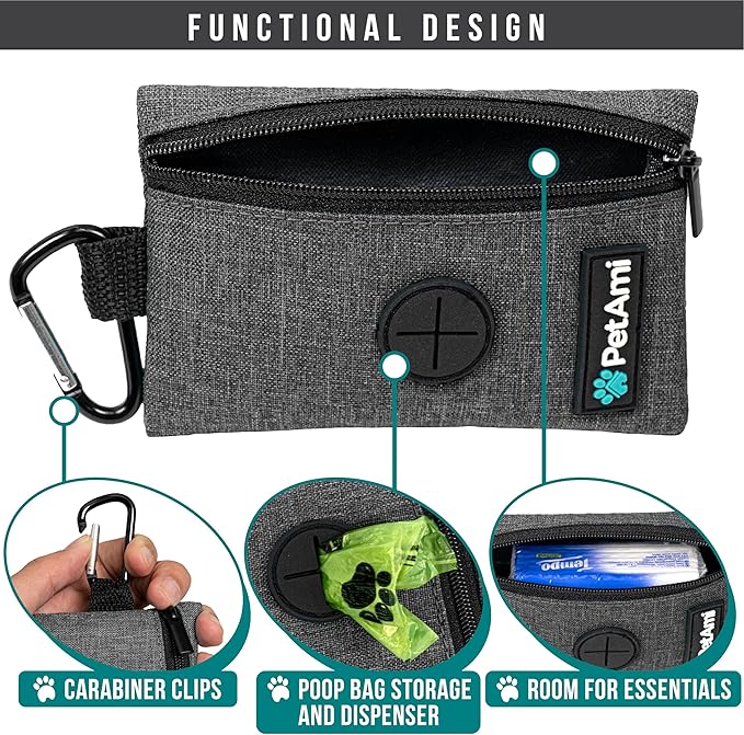 - GRAY DOG WALKING BAG: PetAmi poop bag holder dispenser includes one roll of dog poop bags, measures 5 x .25 x 3.25 inches, and is made of durable oxford polyester. Doggy trash bag carrier is refillable and is compatible with most dog poop bag rolls. This pet travel bag is a great gift for dog mom, dad, parents, owners, and trainers. Comes in multiple colors to mix and match your dog leashes.