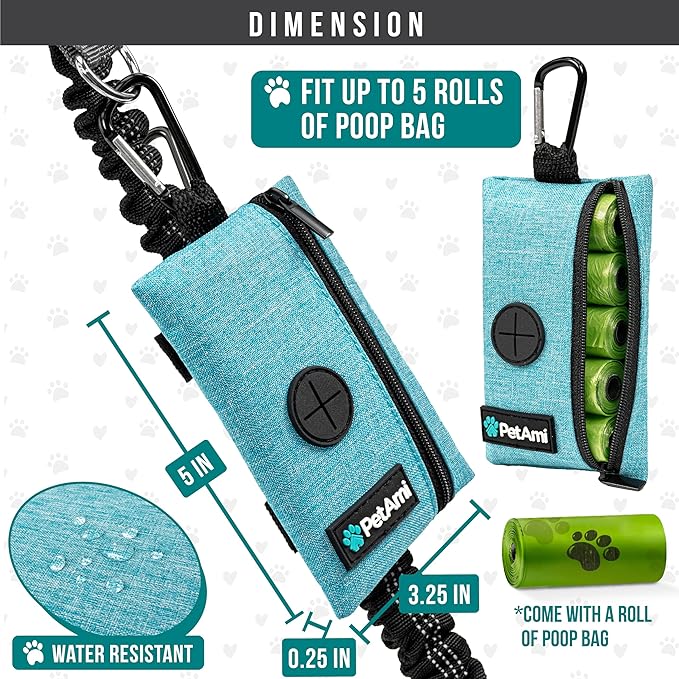 - TEAL BLUE DOG WALKING BAG: PetAmi poop bag holder dispenser includes one roll of dog poop bags, measures 5 x .25 x 3.25 inches, and is made of durable oxford polyester. Doggy trash bag carrier is refillable and is compatible with most dog poop bag rolls. This pet travel bag is a great gift for dog mom, dad, parents, owners, and trainers. Comes in multiple colors to mix and match your dog leashes.