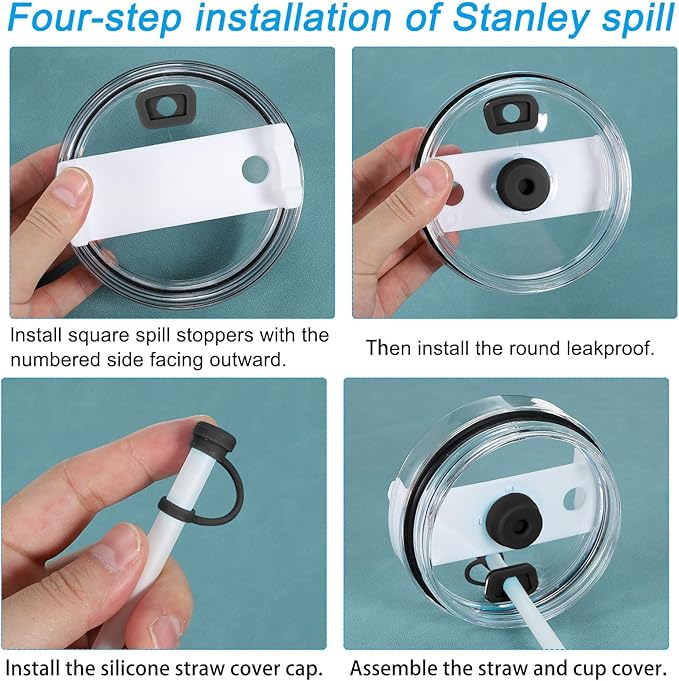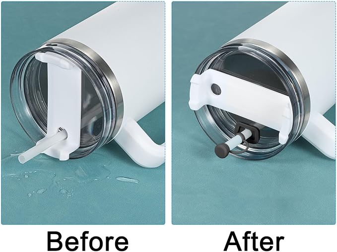- Advantage: The spill stopper is made of silicone material, which is flexible, durable and convenient to clean. The straw cap can prevent water from spilling out of the straw and keep dust out. The round stopper is installed on the inner side of the cup lid, featuring a cross-shaped opening design that ensures sealing while allowing air to enter for easy drinking. The square stopper is installed on the outer side of the cup lid, securing the straw in place and forming a seal to prevent leak.