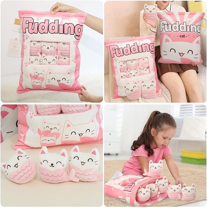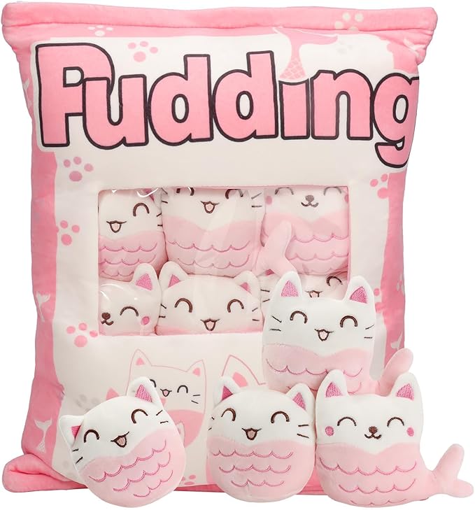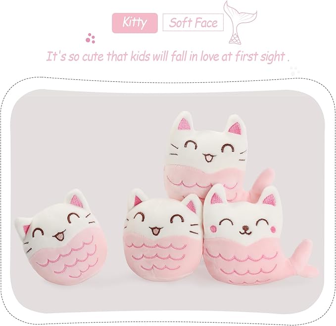 - 【Cute pillow with 6 Little Mermaid Cat Dolls】There are 6 mermaid stuffed animal dolls in each kawaii pillow. A bag of soft stuffed animals cat mermaid toys, so pretty! Open the zipper, and you will not only get a cute throw pillow, but also you can get 6 lovely kitten dolls. They are eye-catching for your kids!