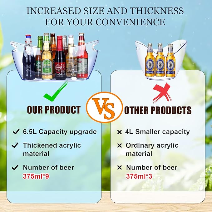 - High Quality: This beer bucket is made of high quality thickened acrylic material with built-in handles for easy portability, sturdy material to prevent water drinking ice from leaking out, and a transparent design that allows you to keep an eye on what's going on inside the clear ice bucket and add ice in time when it melts to keep your drinks in tip-top shape.