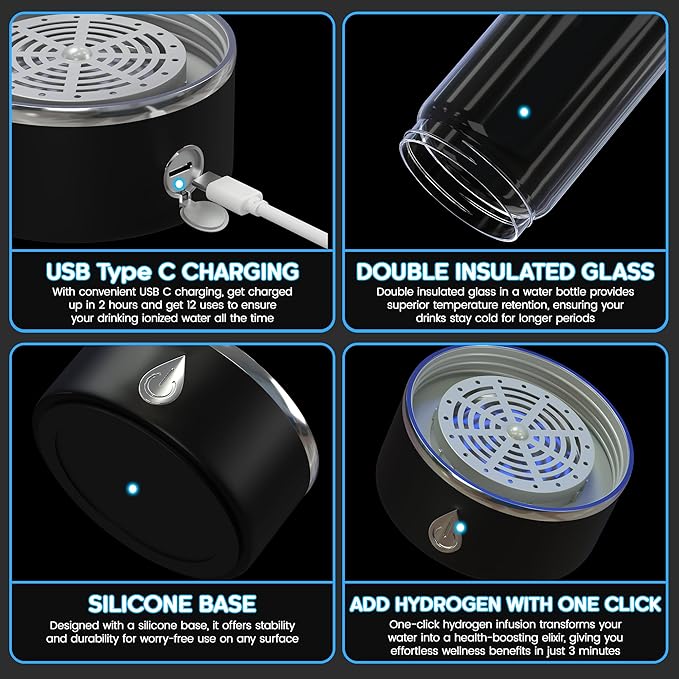 - Advanced Electrolysis Technology - Revitalize your hydration routine with our hydrogenated water bottle, which utilizes an advanced electrolysis technology to help swiftly generate up to 1000 ppb of hydrogen ions in your water, ensuring you receive the maximum benefits of hydrogen-infused hydration with every sip!