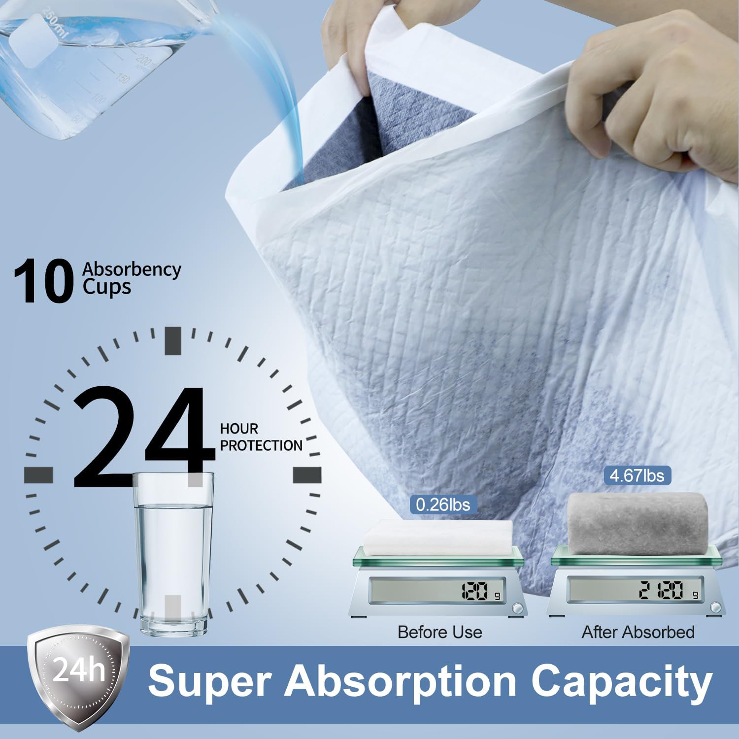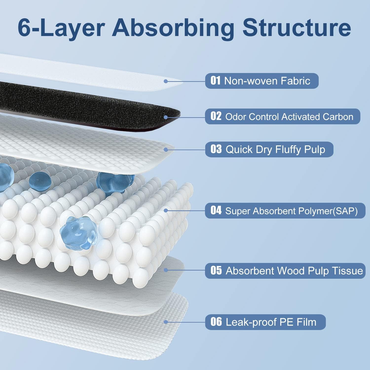 - 【6-Layer Super Absorbent Polymer】The top non-woven fabric layer to absorb liquid quickly. Second activated carbon layer helps to eliminate odors. The third layer of polymer cotton core layer can turn liquid into gel instantly, and the four layer with fluffy pulp for quick dry. The last two layers can keep liquid impermeable and protect your floor from wet.