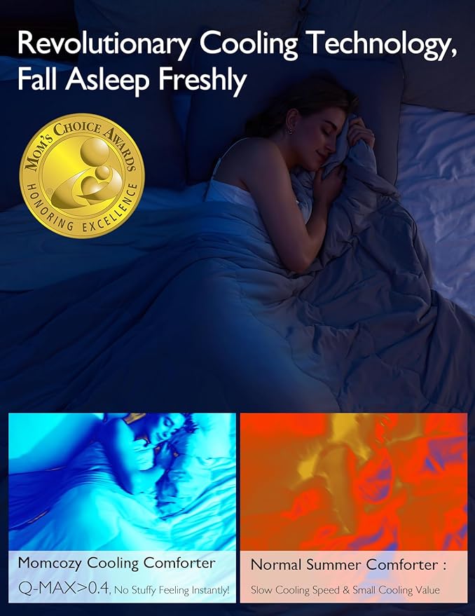 - 【OEKO Certified and Award-Winning Cool】 Momcozy won Mom's Choice Awards, Best of the Pump Awards, and Best of CNET with trusted products that make parenting more convenient and comfortable for families. Momcozy's cooling comforter excels as always. Meets OEKO standard 100 and achieves exceptional natural coolness with fibers five times finer than silk and advanced knitting technology, there is no any nanoparticles.