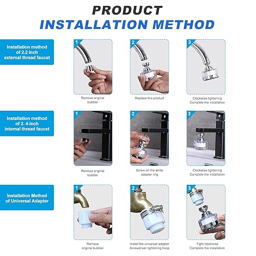 - 【360° ROTATING DESIGN】 : Kitchen faucet water filter can be rotated 360°easy to install,Multi Angle Rotation. Water faucet filter can effectively increase the water pressure, flushes powerfully and prevent splashing, and saves water, make it easier to clean vegetables, plates and other kitchen stuff,and other kitchen stuff, is very practical kitchen faucetfilter.