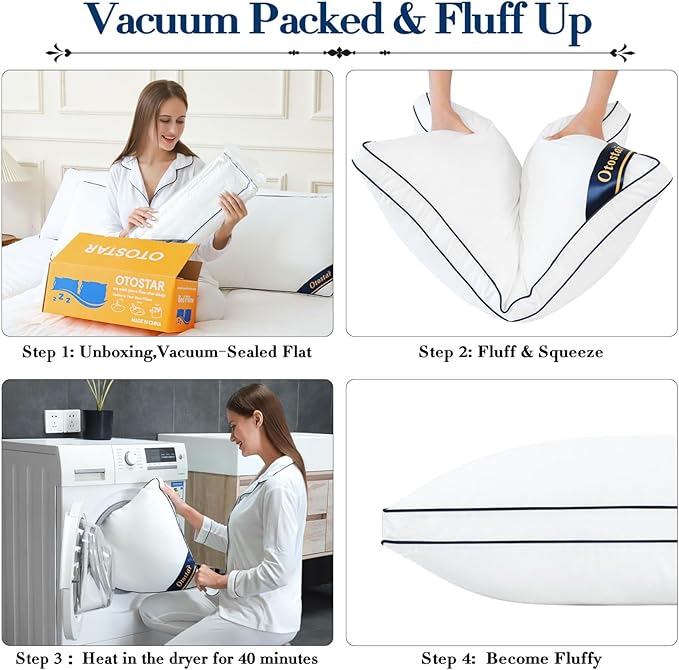 - FLUFFING INSTRUCTIONS:1.We recommend that you use a dryer,it will fluff up the pillow more quickly. (Shake vigorously and massage evenly the pillow will also help to make it fluffier.) 2.Open the plastic wrap and remove the pillows; Press the pillows vigorously; Squeeze the pillows vigorously; Fold the pillows vigorously; Wait 24-48 hours. Once fully loft, use the pillows as desired