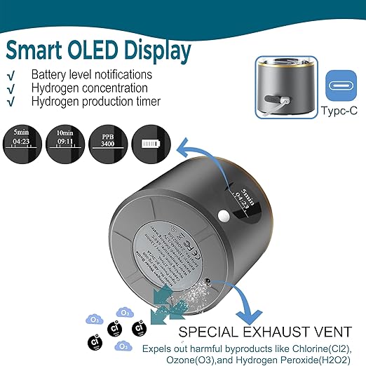 - 【Smart OLED Display】User-friendly display features include battery level notifications (so you never worry about forgetting to charge your hydrohealth water bottle), hydrogen production timer, hydrogen concentration, and one-touch mode switching, making it easy to operate.