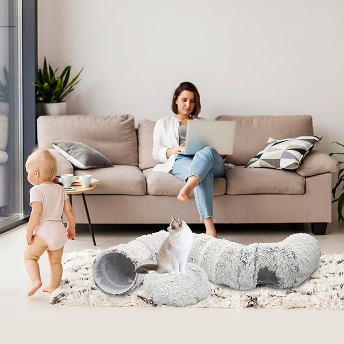 KOMUSMO Cat Tunnel Bed with Central Mat and Hanging Ball Toy, Large Cat Cave Donut for Indoor Cats, Soft Plush Fluffy Peekaboo Cat Bed Cave Collapsible for Small Medium Large Cats Kittens
