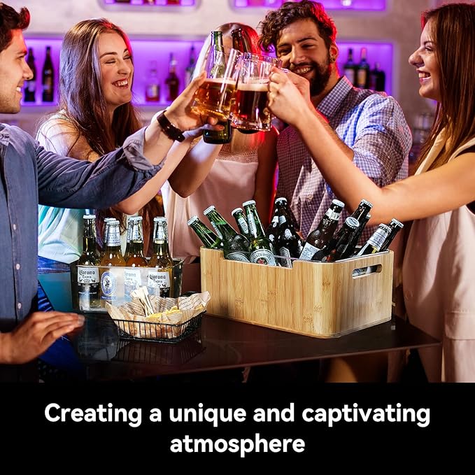 - 【LED Colorful Light Design】 This thoughtfully designed wooden ice bucket not only features a large storage capacity but also incorporates three single-use LED lights. Each light can last up to 72 hours without frequent replacements, providing convenience and peace of mind. Additionally, these lights offer three adjustable lighting modes, ranging from soft warm light to brilliant colorful displays, easily switching to add endless fun to your gatherings.