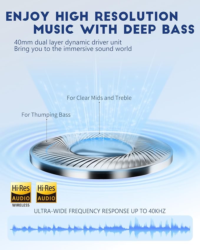 - 【PREMIUM Hi-Res Sound on Wired or wireless Connection】: Equipped with Dual 40mm drivers, iDiskk wireless headphones stands out with superior Hi-Res audio with well-balanced thumping bass on the lows and crystal clarity on the high.