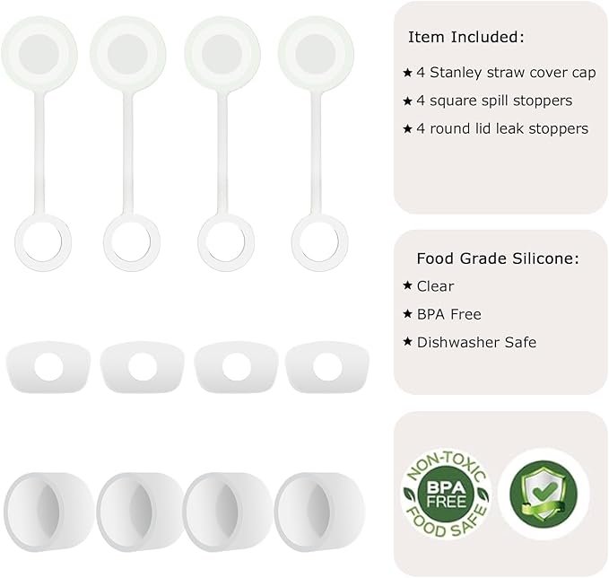- 3.Cup accessories set including 4 straw cover cap, 4 square spill stopper, 4 round leak stopper
