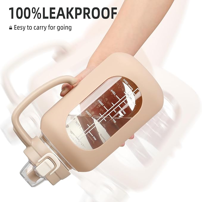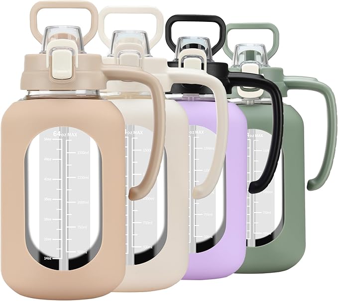 - 【Glass Water Bottle with Silicone Sleeve】Olivego big water bottle for easy to carry and use. The half gallon water bottle with straw has an anti-slip and high quality silicone sleeve to protect the glass water bottle and help prevent it from being slippery in your hands or slight bumps.The handle ensures a firm grip & our wide mouth flip cap spout makes pouring easy & smooth.