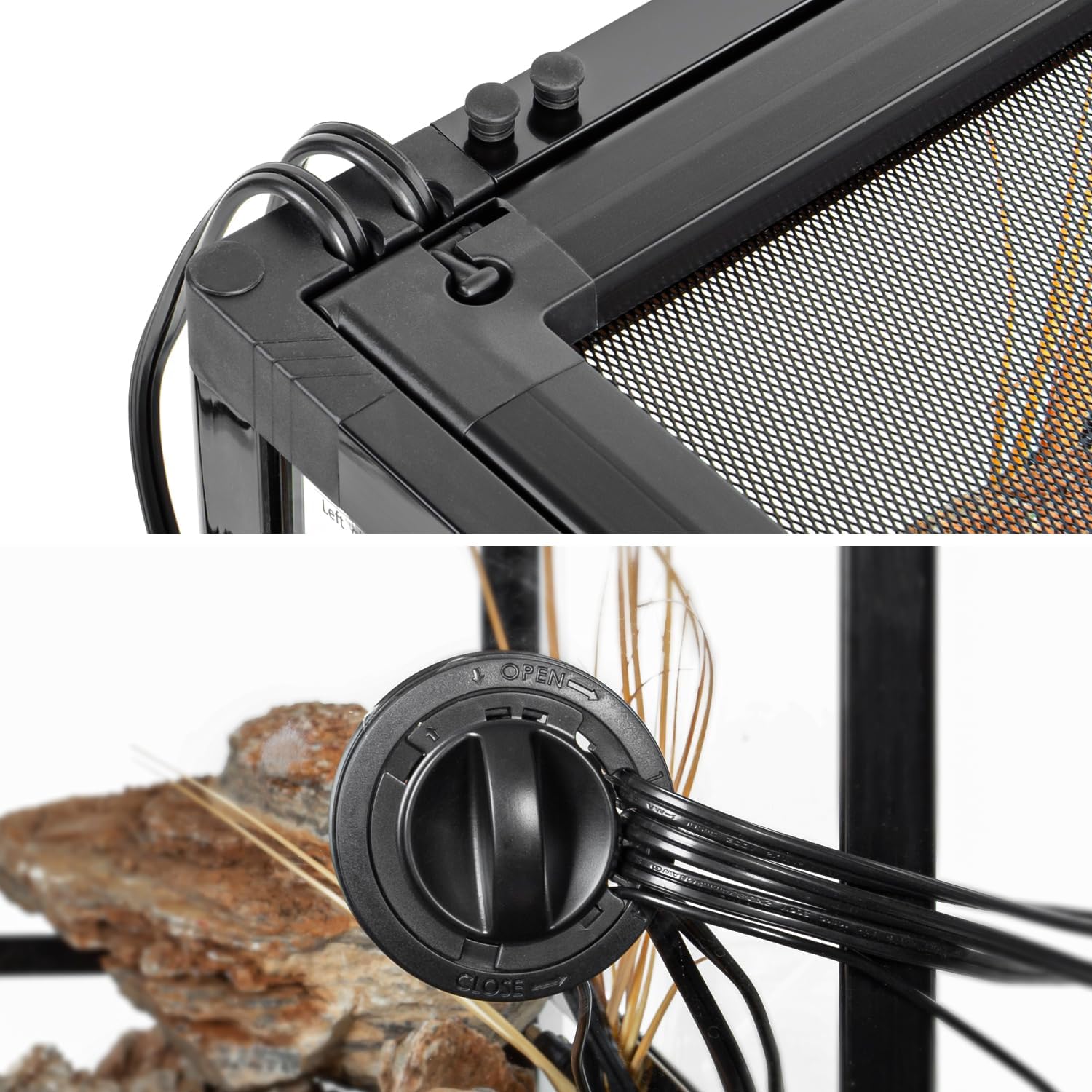 - 【Cable Pass System】In order to convenient for temperature and humidity probes or extra cables insert into the inside of reptile tank, we have design 6 cable holes on the top,and a cable pass system on the side, the cable pass system is closable wire or tube inlets to prevents reptiles from escaping.