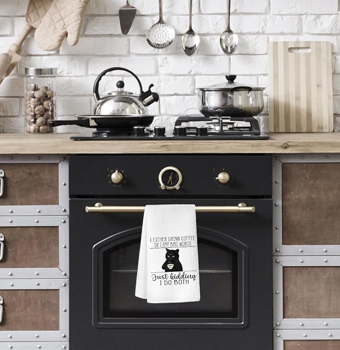Coffee Kitchen Hand Towels - Black Cat Dish Towels, Bar Accessories Decor, Housewarming Gift for Cat Lovers, 'I Either Drink Coffee or I Say Bad Words' 16x24