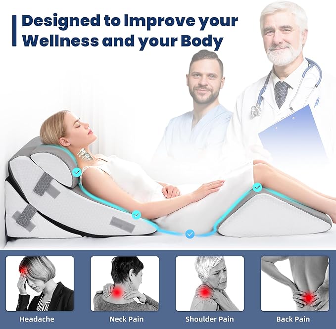- Multifunctional:The BDEUS wedge pillow set consists of four parts that can be combined to suit your needs. Adjust the angle for sitting up, lying down, or sleeping comfortably. Use the leg elevation pillow to relieve discomfort and pressure on your legs and knees. The elongated foam wedge can support your head or serve as an arm pillow, offering versatility for any situation.