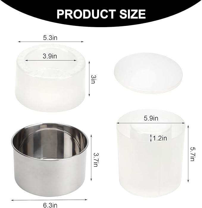 - Item Dimensions: Ice bucket mold with lid has diameter about 5.9 inch and height is 5.7 inch. The stainless steel drip tray has diameter about 6.3 inch and height is 3.7 inch. The base has diameter about 5.3 inch and height is 5.3 inch.