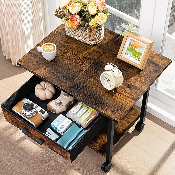 - [Large Printer Stand] 20.08 "L X 15.75''W Extra large desktop can hold different sizes of printers. The fabric drawer and bottom shelf provide extra storage space. You can place it on the desktop or underneath the table for easy access. The printer desk stand is so flexible and convenient to effortlessly optimize your desk, living room and kitchen.