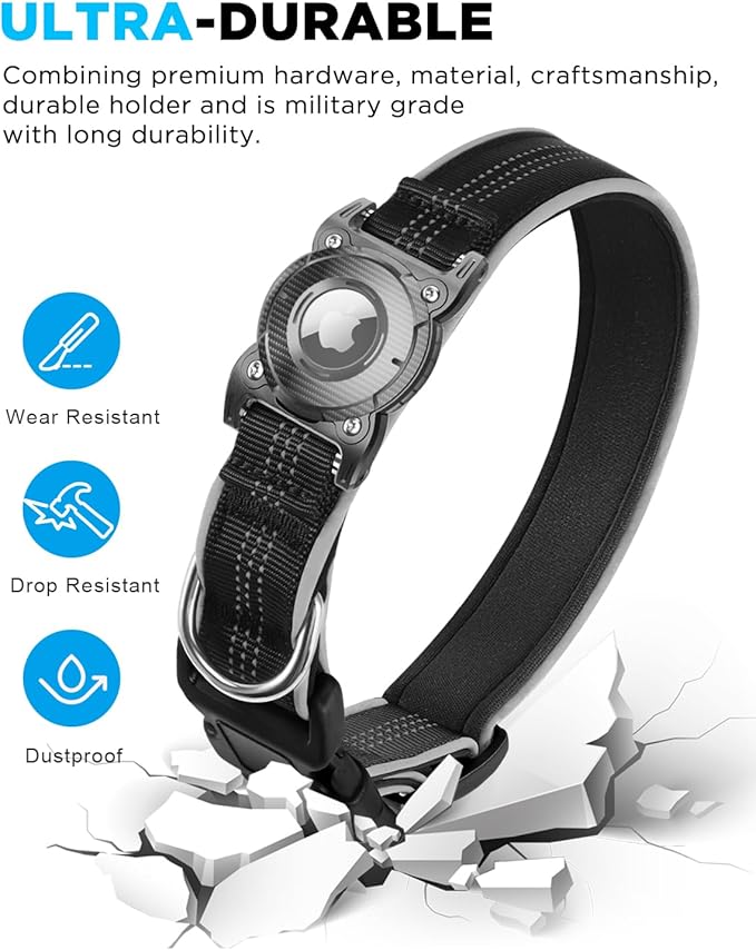 - Ultra-Durable: Air tag dog collar combining premium hardware, material, craftsmanship, durable air tag holder and is military grade with long durability. Metal sides that attaches to the collar will never breaks
