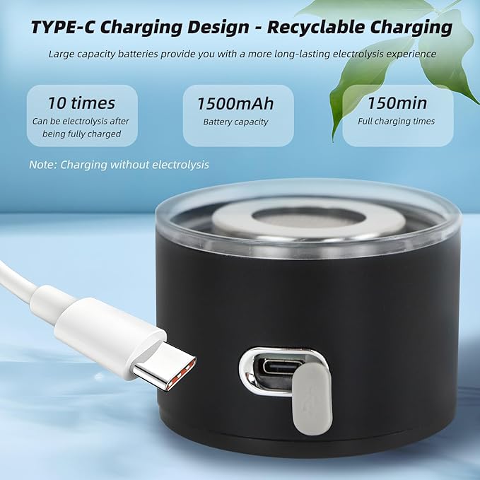 - 【Unique light cues】Use USB charging cable(Included) to charge the Hydrogen water bottle. Red flashing light means no power. Red light indicates is charging, the green light indicates charging is complete, which takes 2-3 hours to be fully charged, and it can work 15 times after full charge. Press the power button with "di" voice to start electrolysis Hydrogen, while the color LED lights up, and after 6 minutes the Hydrogen water generator is complete, the lights disappear and "di di" voice.