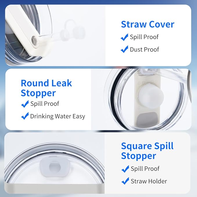 - 【Modern minimalist design】These straw toppers are not only stylish, but practical too. The straw tip cover cap prevents water from spilling out of the straw, round leak proof plug installed in the middle of the inside of the lid for sealing & square spill stopper seal installed in the straw hole of the lid, These three kits ensure the tightness of the water cup, and can effectively prevent debris and dust from entering the water cup, making drinking water easy and healthy.