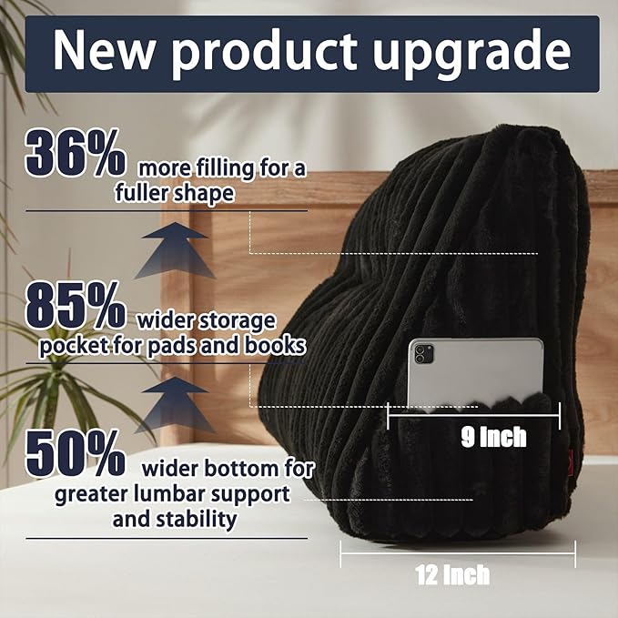 - [Thicker bottom and wider storage bag] This improved headboard pillow has increased the bottom depth by 50% and the pocket width by 85%. The thick bottom provides sufficient lumbar support and stability, and the greatly widened storage bag allows you to store large-sized pads and books, which is unique.