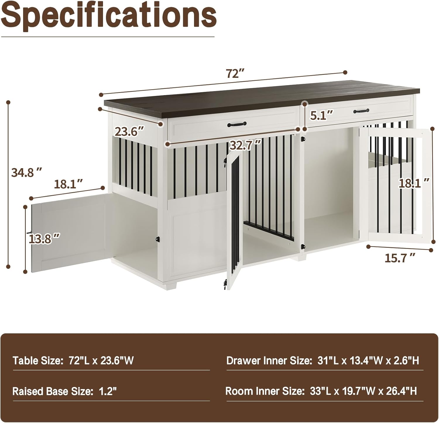 Dog Crate Furniture - Indoor Wood Dog Kennel Furniture 4 Doors with Divider and 2 Drawers - 72" L x 23.6" W x 34.8" H, White