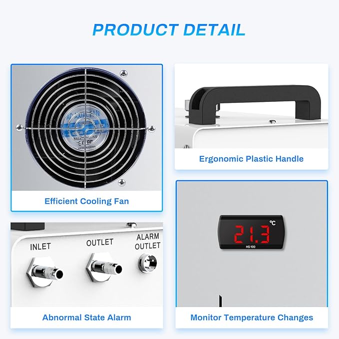- Multiple Applications: The CW-3000 series of professional industrial laser coolers are suitable for cooling CO2 glass laser tubes up to 100W (at low room temperature) on laser engraving and cutting machines.