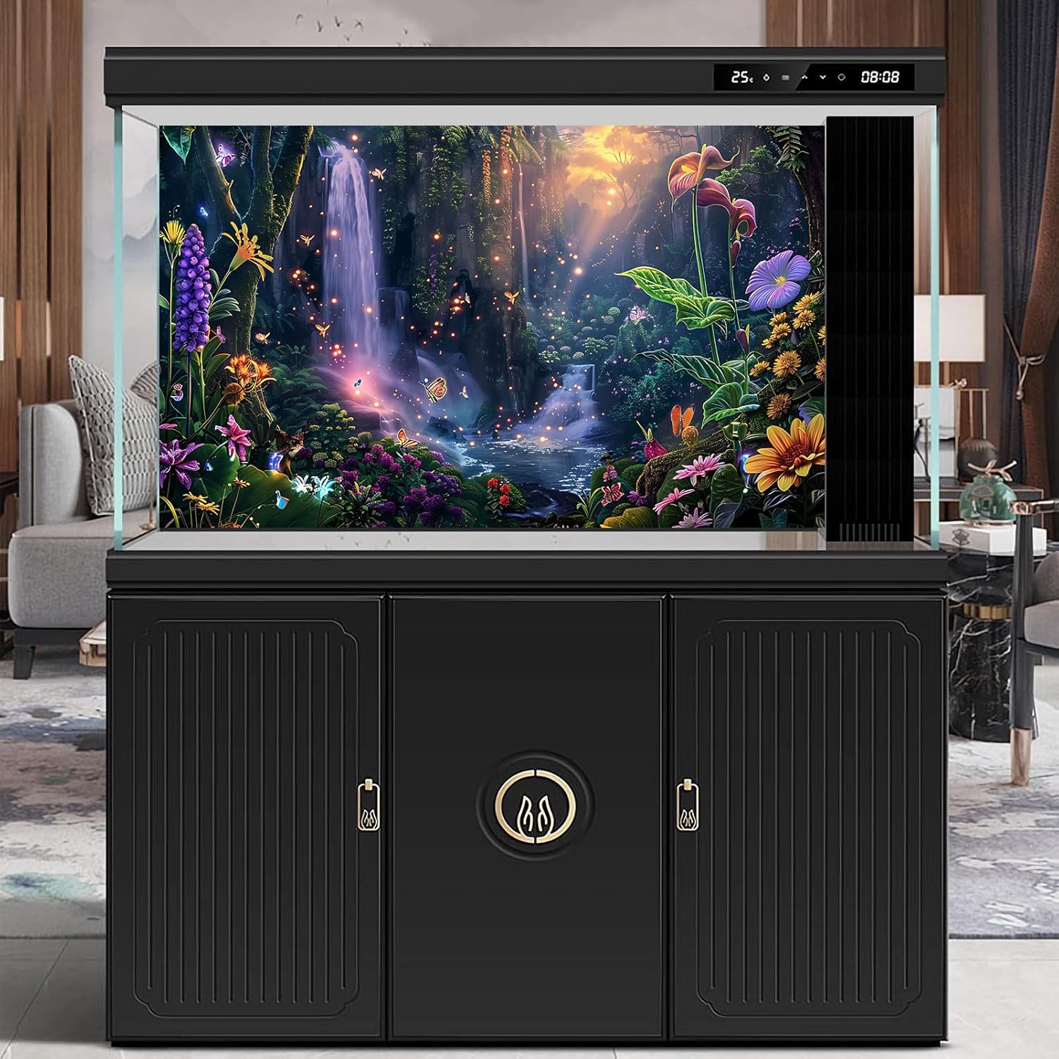 Fantasy Garden Aquarium Background Sunset Waterfall and Flowers Terrarium Backdrop Tropical Forest Lush Plant Magic Butterfly Lights Flowers Fish Tank Background Poster Decorations 72x24in