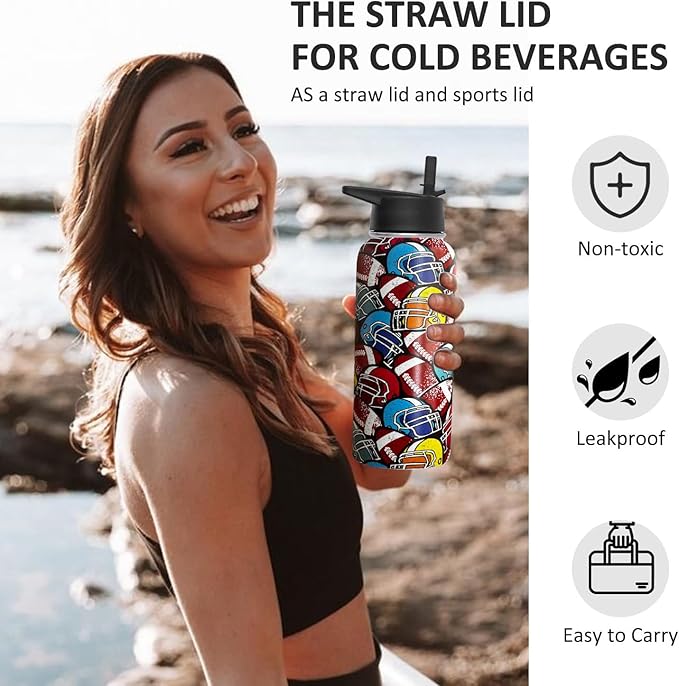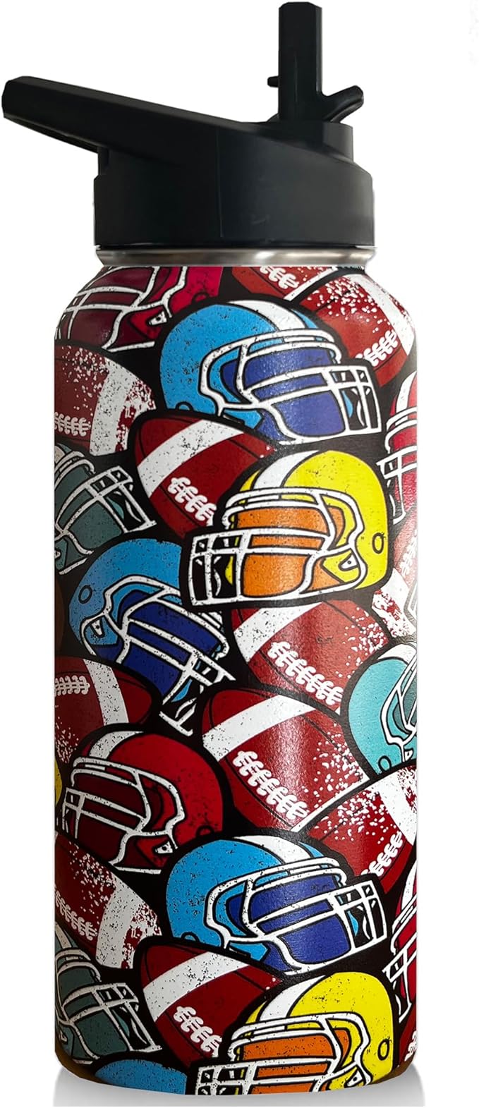 32 oz Football Water Bottle Insulated Vacuum Stainless Steel Sports Water Bottle with 2 Lids (Straw and Spout Lid) for Gym Camping Hiking