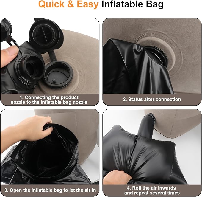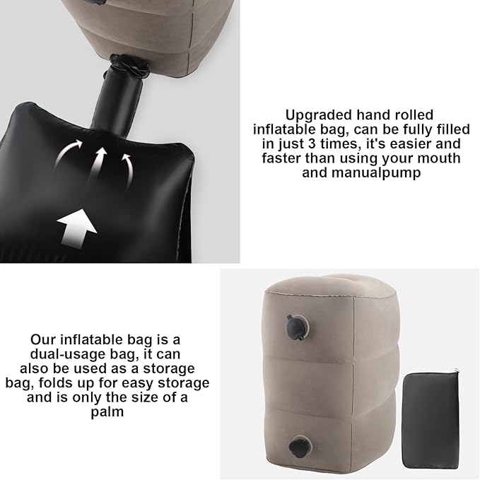 - 【Quick & Easy Inflatable Bag】Our upgraded travel inflatable foot rest pillow comes with a quick inflatable bag, which is very easy, fast and convenient, and can be fully filled in just 3 times, release the air only 3 or 5 seconds. It is faster than using your mouth and manual pump, also it takes away the hassle of bringing a pump and making noise in flight. This inflatable bag is a dual-usage bag, it can also be used as a storage bag, it is easily attached to your carry-on.