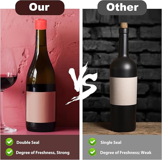 - UNIVERSAL FIT DESIGN: The vacuum rubber champagne stopper seal is designed to fit most standard wine bottles and other similar containers, providing a snug fit that keeps your wine fresh and delicious, outperforming traditional wine bottle corks.