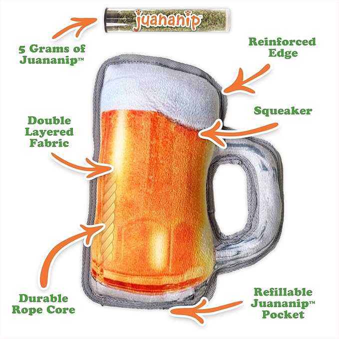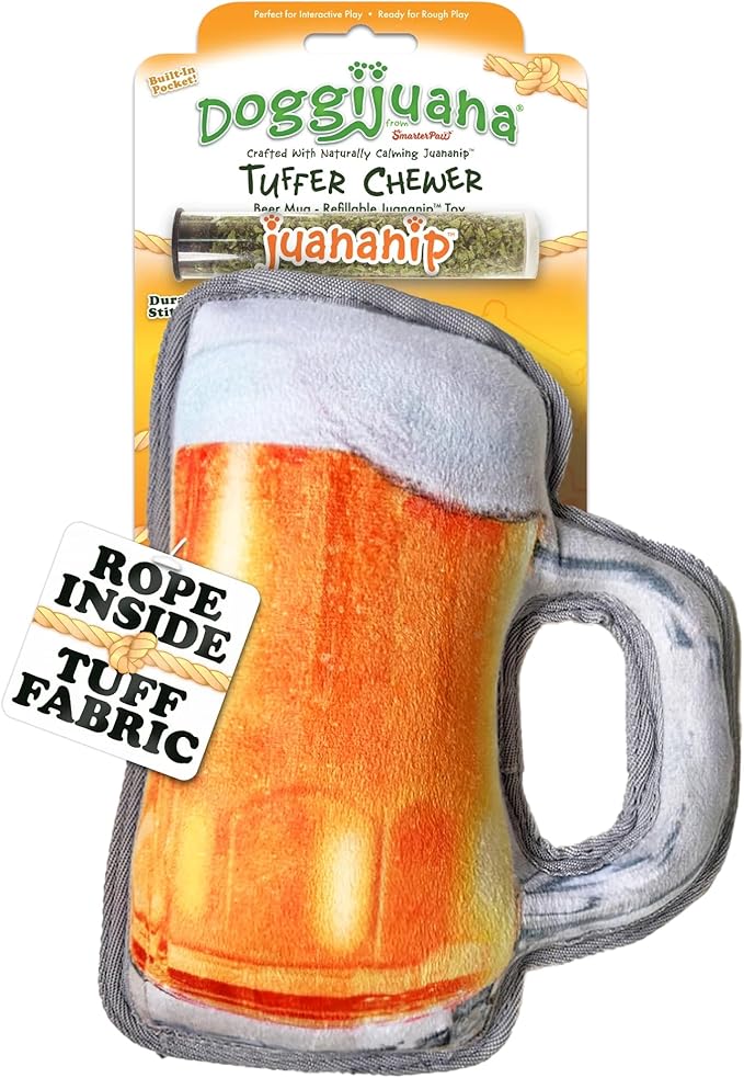 Doggijuana Tuffer Chewer Plush Dog Toy | Funny Dog Toy Plush with Juananip Catnip for Dogs | Calming Aid for Dogs | Interactive Squeaky Chew Toy for Play (Beer Mug Toy)