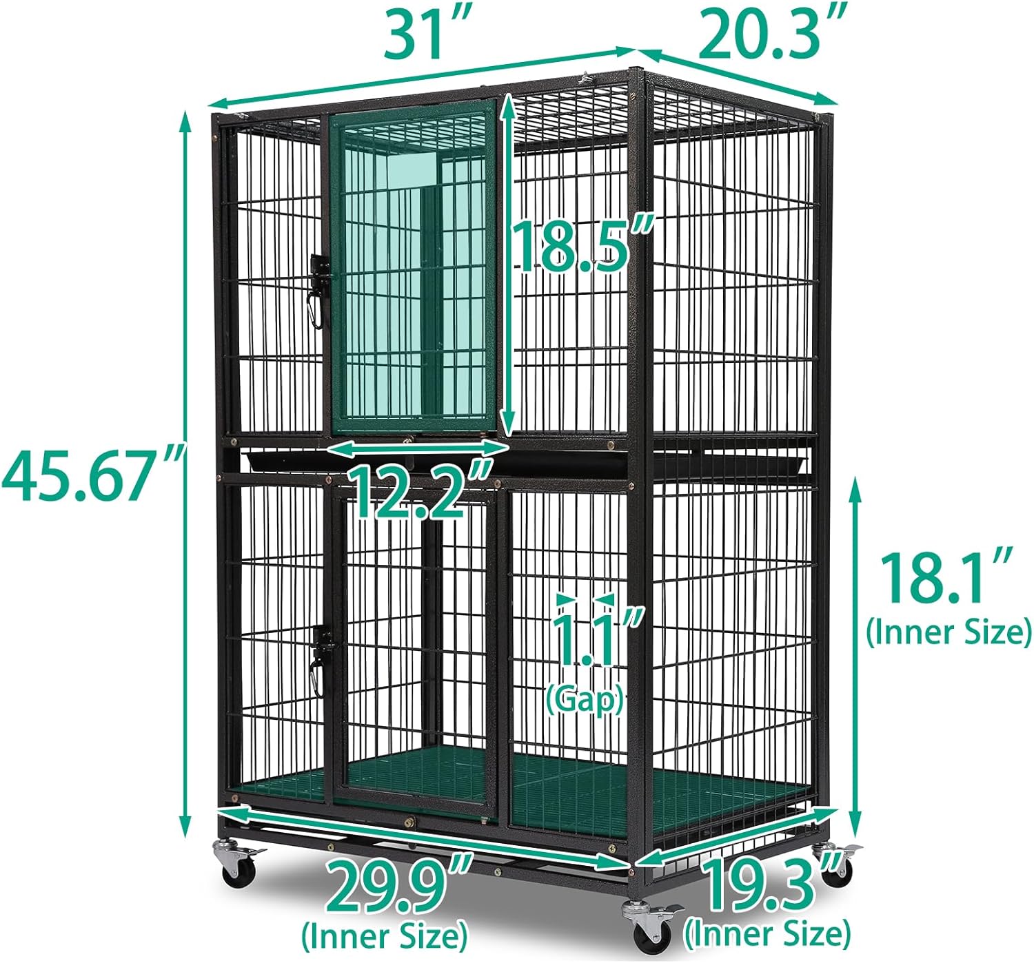 - Suitable Breeds: This crate measures 31"L × 20"W × 46"H overall, with a single-tier interior space of 30"L × 19.3"W × 18"H. It is ideal for small to medium-small breeds dogs such Bulldog, Bichon Frise, Papillon, Chihuahua, Shih Tzu, and Jack Russell Terrier—and fits dogs within these breeds up to 26" in body length and 14" in height