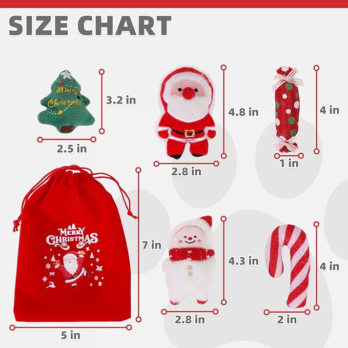 - 5 PACK CATNIP TOYS IN ONE PACKAGE: You will receive a beautifully packaged gift bag filled with Christmas atmosphere (7 inches in length, 5.2 inches in width), as well as five cute Christmas toys, including a Santa Claus, a snowman, a Christmas tree, a candy, and a cane. It has rich colors and is the perfect gift for cute cats.