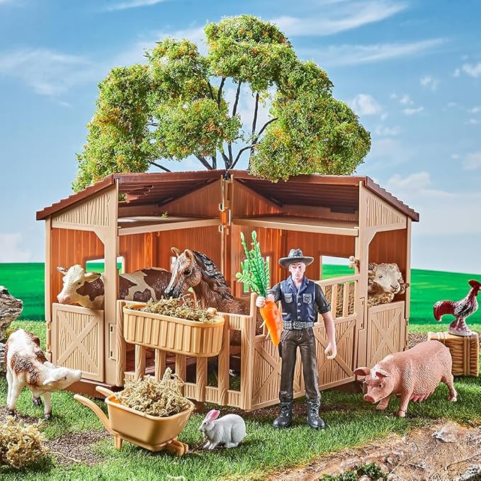 - Farm animal Toy Set- Including 24 realistic animal figures, a large stable, 20 props (fences, tresses,garden cart, shovel and so on), activity play mat, farm animals encyclopedia, gift box