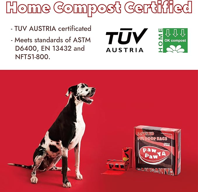 - DOG POOP BAGS ROLLS BIODEGRADABLE: Completely biodegradable dog poop bags that allow plastic bags to return to nature, made from a blend of PBAT, PLA, and cornstarch, designed to fully degrade in just 180 days under compost conditions,return to nature. beyond traditional plastic bags, Our dog poop bags rolls is certificated by TUV Austria(OK Compost), and meets standards of ASTM D6400, EN 13432 & NFT51-800, Every time you use this doggie poop bags, you are helping to protect the environment, poop bags for dogs can break down into water and carbon dioxide, leaving no harmful residue. They meet international compostability standards, making them a responsible, sustainable choice.