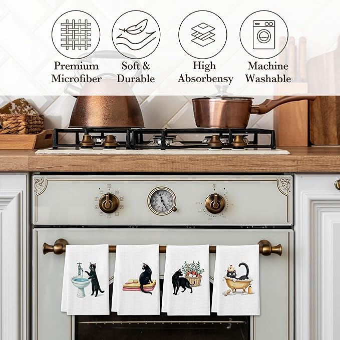 - 【Size and Material】Set of 4, approximately 16×24 inches (40×60 cm). This set of cat-themed kitchen towels is made of microfiber. It is lint-free and quick-drying, versatile, and works well for wiping glass.