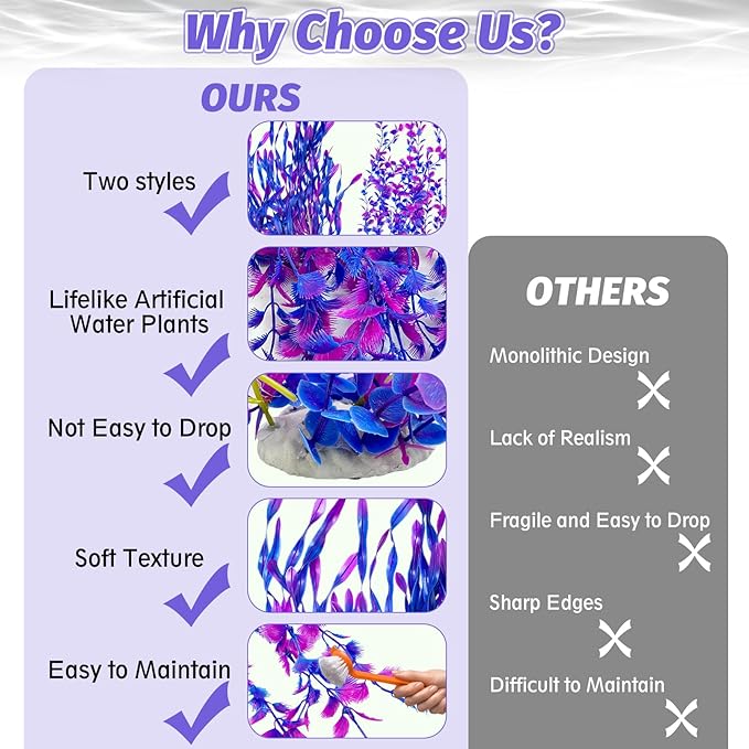 - RELIABLE MATERIAL : Our fake water plant leaves and roots are made of soft plastic material that won't affect the water quality. The leaves do not have sharp edges and have a soft texture, which can effectively avoid any physical damage to the fish while swimming or playing, and can better beautify the e-nvironment, maintain stability and not fade. Provide a comfortable and clean living e-nvironment for fish. Whether placed in a saltwater e-nvironment or freshwater e-nvironment, it can be perfectly adapted