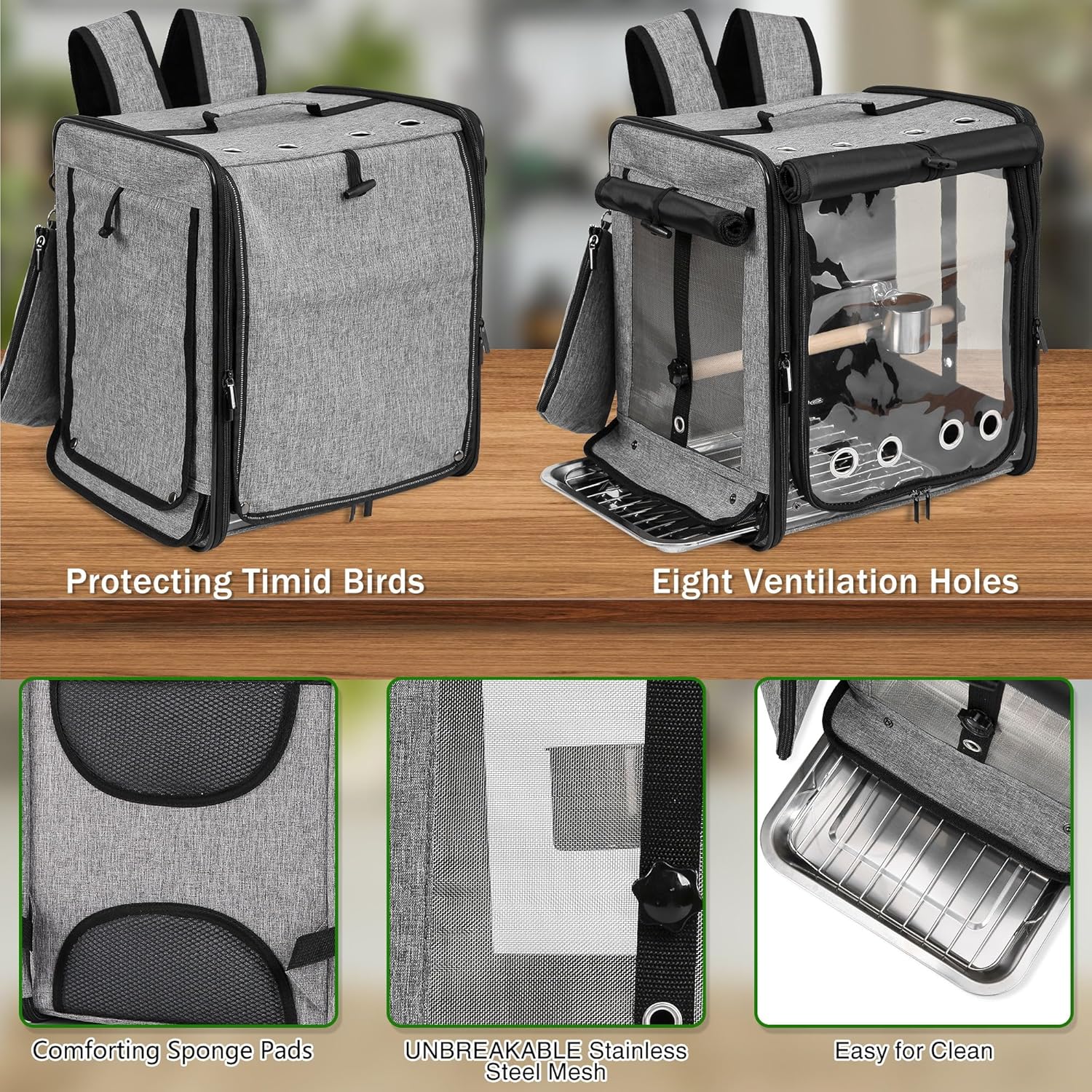 - 【ADDITIONAL OPENING AT THE BOTTOM FOR EASY CLEANING】We have designed a new opening and zipper at the bottom of the bird carrier backpack. Convenient for you to clean the tray at any time. This way, even for long-distance travel, you can clean the tray and keep it clean at any time without dismantling the perch or taking out the birds.