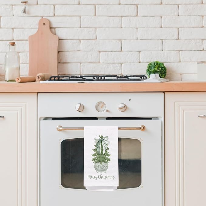 Merry Chinoiserie Christmas Kitchen Towels, Sage Green Porcelain Tree Hand Towels for Bathroom, Bow Dish Towels, Kitchen Bathroom Decor, 16x24 Inch