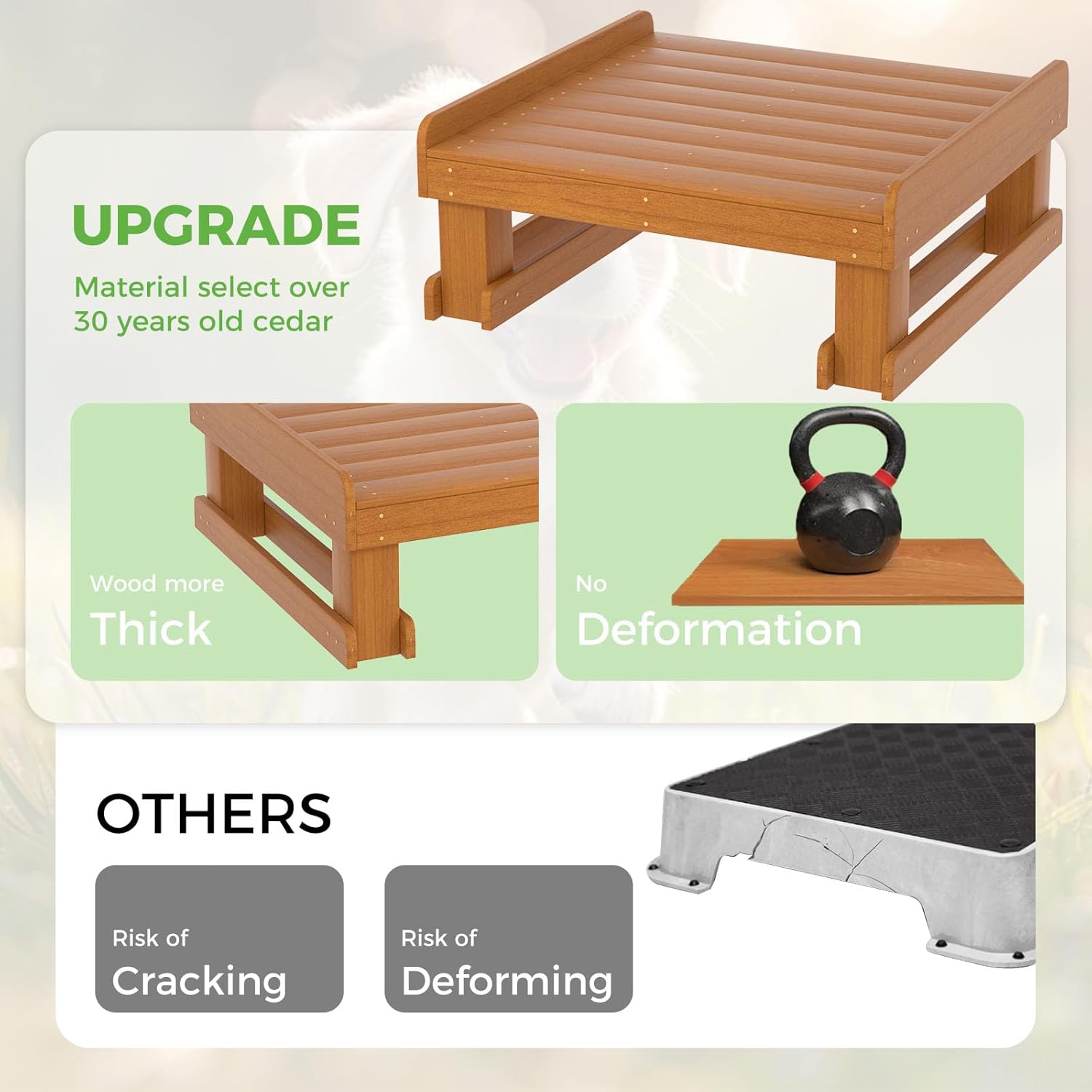 - Wood Materials: The base of wooden platform is a strong fir wood with our waterproof coating surface for sure pet footing. It’s UV stabilized and washable for limitless outdoor use