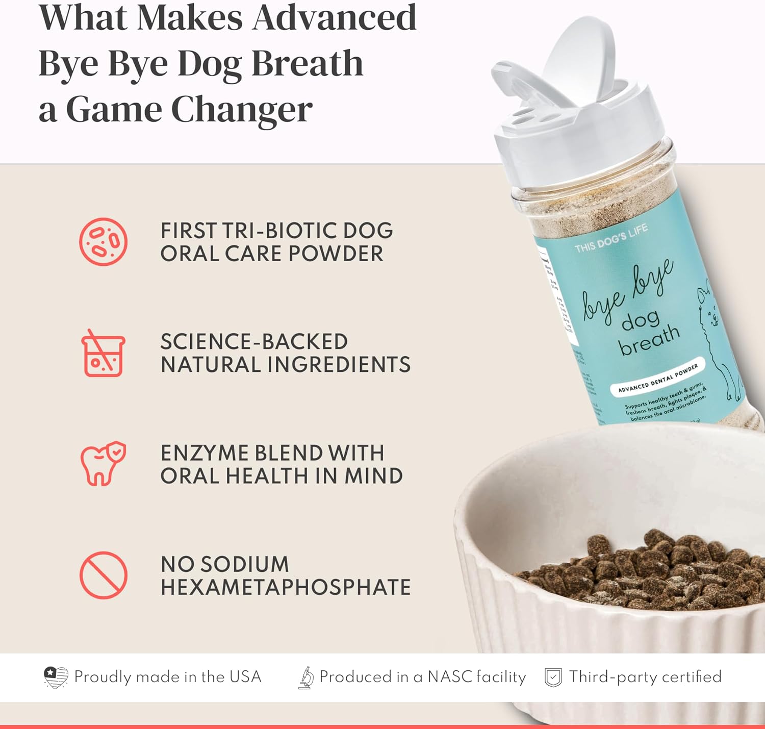 - Microbiome-Focused Formulation: Features a patent-pending blend of prebiotics, probiotics, and postbiotics that work together to help support a balanced oral and gut microbiome, where bad breath begins. May help reduce common causes of unpleasant dog breath when used regularly as directed and part of an overall dental regime.