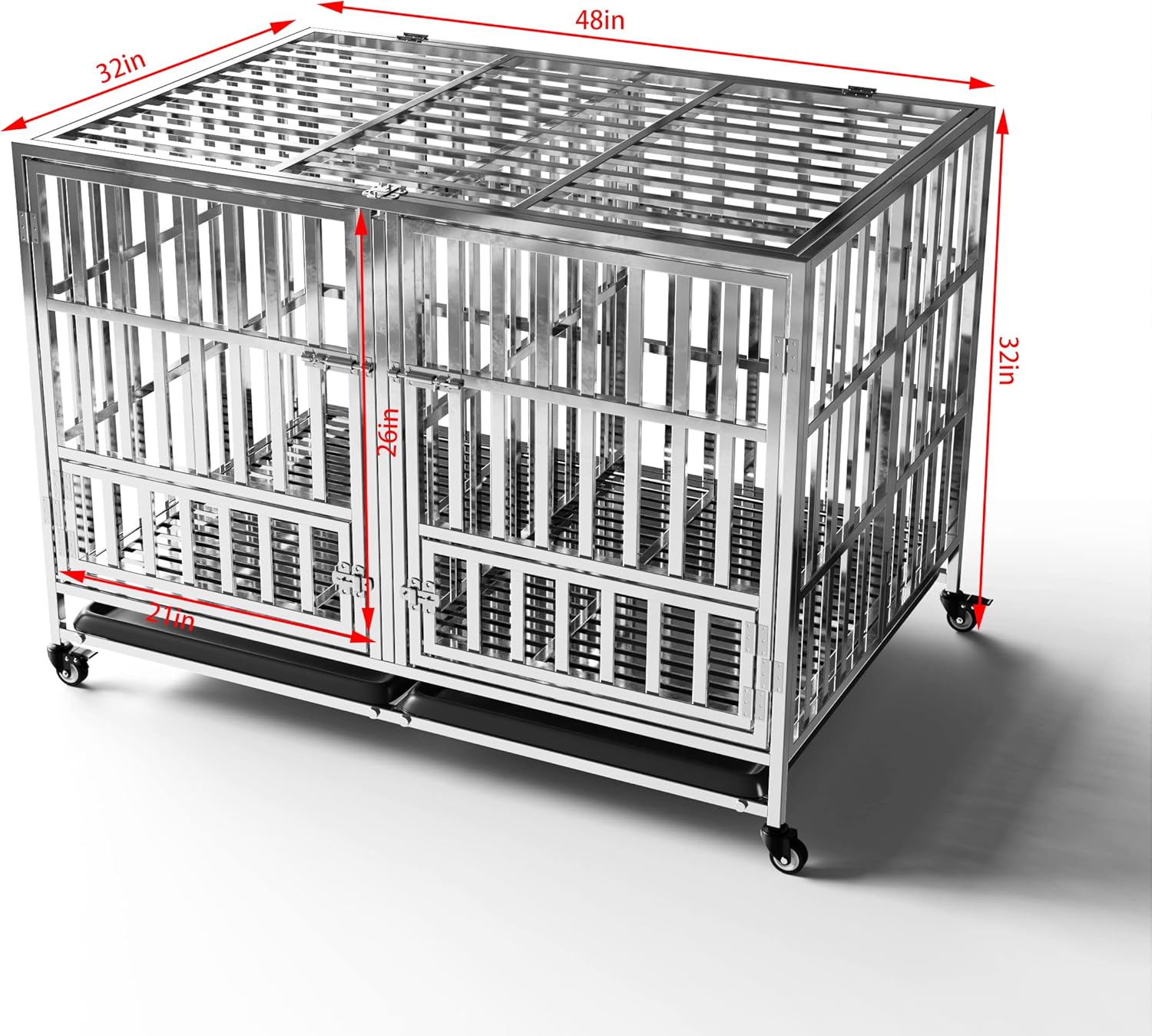Collapsible Stainless Steel Dog Crate, 30" 37" 42" 48" Sizes, Lockable Wheel, with Tray, Stackable, Heavy Duty, Divider, Indoor and Outdoor (48insm)