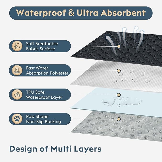 - ✔️ 【Leakproof & Anti-Slip】 Our pee pads ensure both your pet's safety and your peace of mind. With a strong waterproof TPU inner layer, leaks are prevented, protecting your floor. The upgraded non-slip backing keeps the liners secure, providing stability for your pet and minimizing accidents.