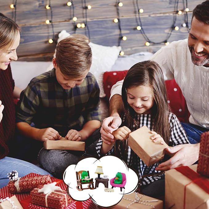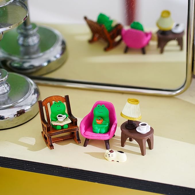 - Cute Desktop Figurines: This set of mini figurines includes a frog reading and drinking coffee, a frog tasting wine, a kitten, a wooden rocking chair, a pink sofa stool and a table lamp, a total of 6 pieces.