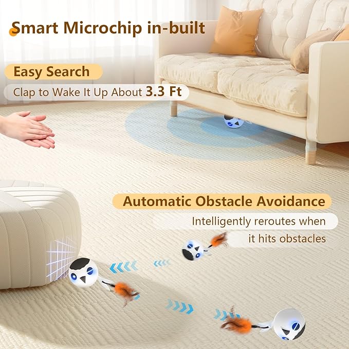 - 🐥CAT AFTER MOUSE GAME: Interactive cat toys ball with a teaser feather tail is shaken or swung in front of the cat, imitate the random movement of small animals, emit sounds and LED flashing attract cats' attention, prompting cats to chase, jump and run. let cats experience a "natural" game, enhance the sense of reality and satisfaction. Through fast and random movements, helping cats consume excess energy and stay energetic and healthy.