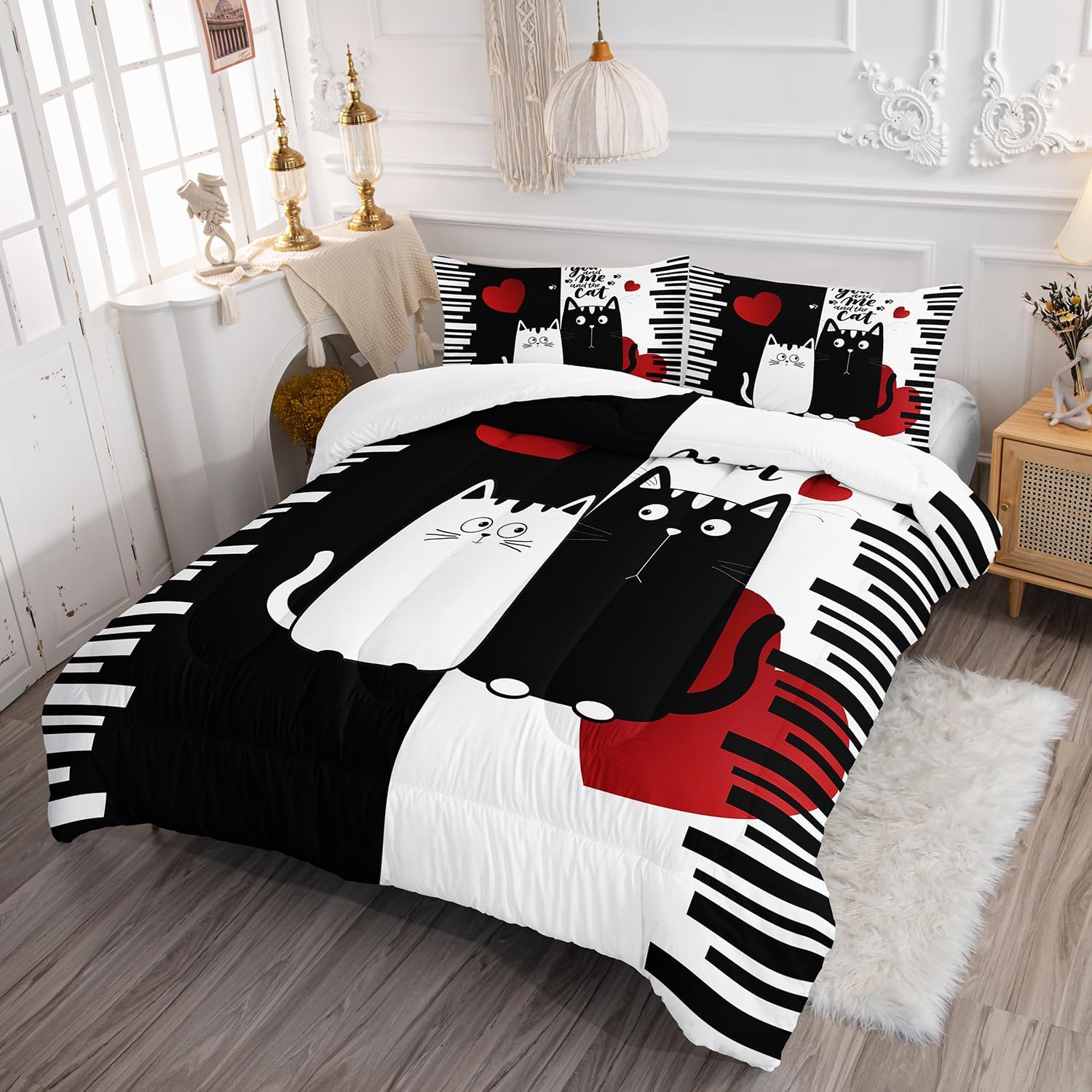 Kawaii Pet Cat Themed Comforter 3Pcs Full Lover's Kitten Animal Bedding Set for Cat Lover Kid Teen Girl Boy Black White Cat Heart Pattern Quilt Bed Decor with 1 Comforter and 2 Pillowcases