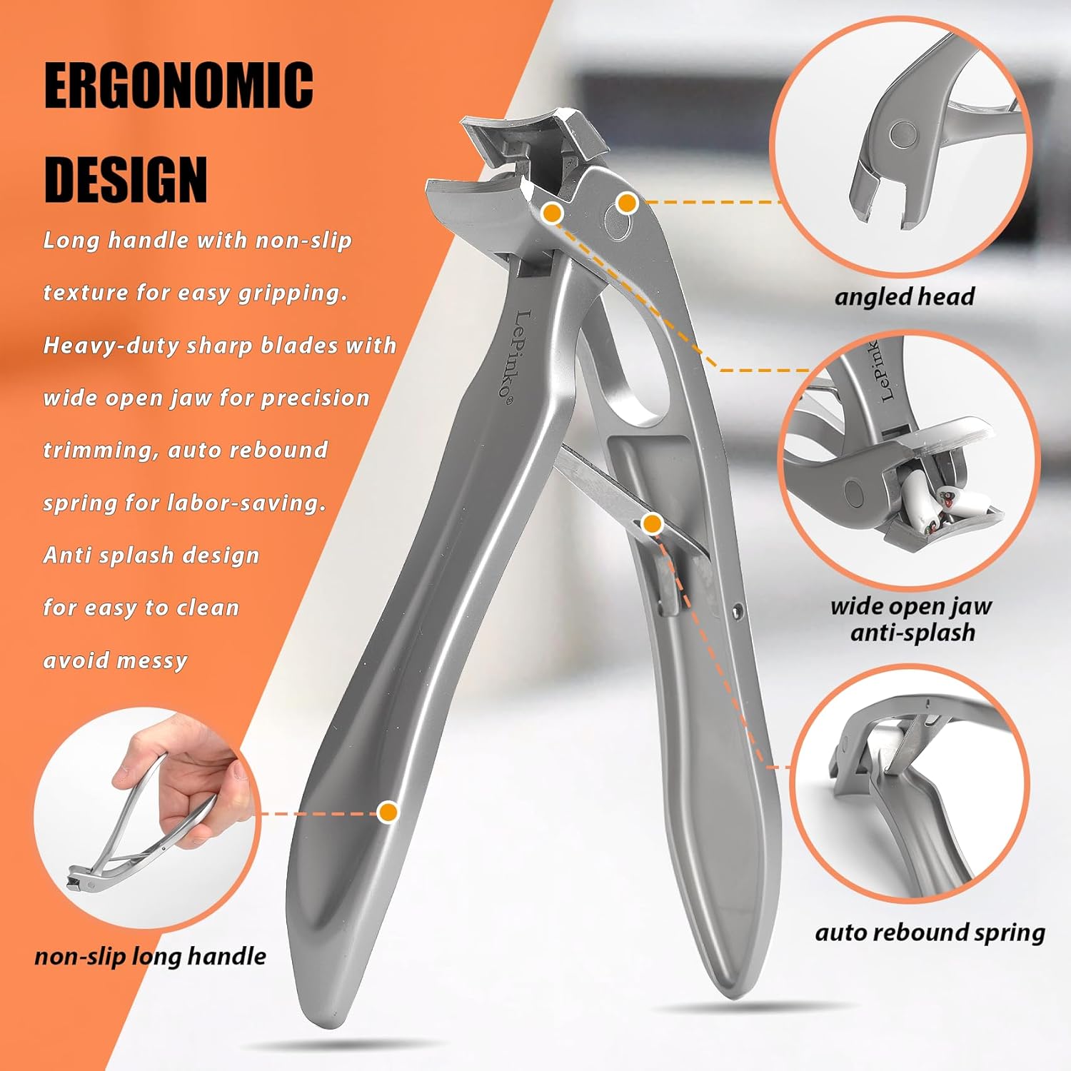 - Ergonomic Design - Long handle with non-slip texture for easy gripping. Auto rebound spring for labor-saving. Anti-splash with catcher for easy to clean avoid messy. Come with a nano glass nail polisher to quickly and safely smooth uneven nail and toenail surfaces.
