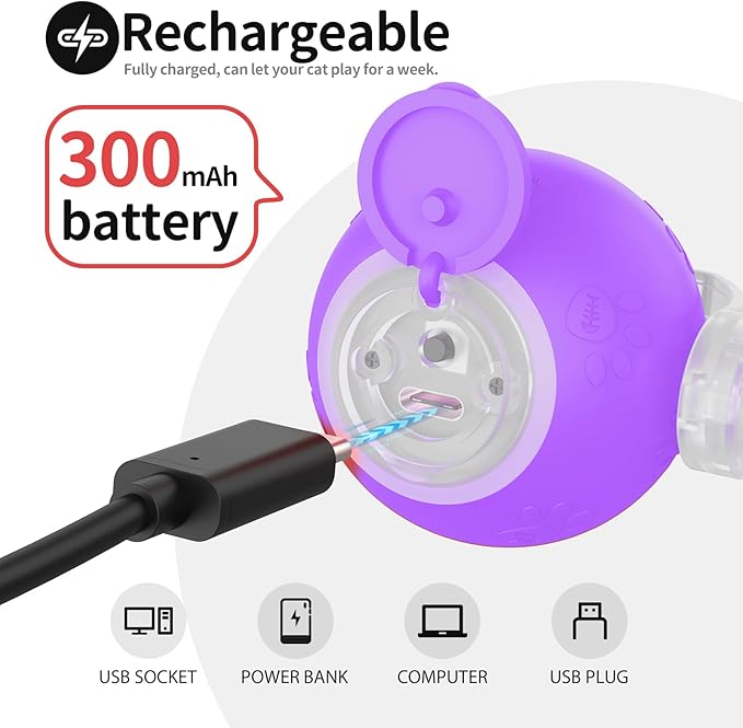 - **Convenient Type-C Charging**: The interactive cat toy comes with a built-in rechargeable battery and includes a Type-C USB cable for easy charging. Simply plug it in using your mobile phone charger, and your kitty can enjoy playtime without interruption! Please note, it is not waterproof, so clean it with a damp cloth when needed.