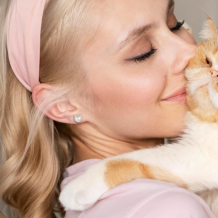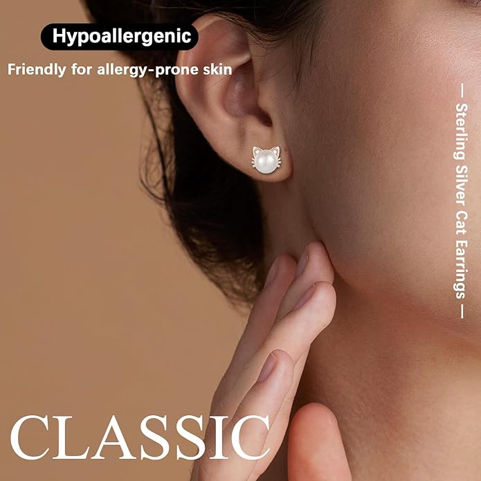925 Sterling Silver Freshwater Pearl Cat Stud Earrings for Women, Cat CZ Studs Hypoallergenic Jewelry Gift